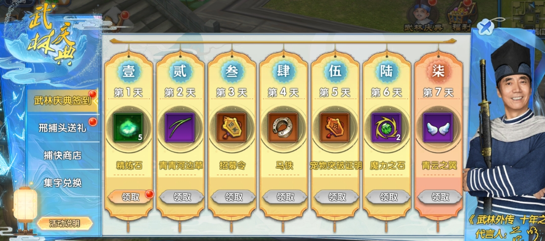 如果此时还未考虑好是否付费,也可等待第二天武林庆典签到赠送的【面饰-胡子】青青河边草。武林庆典中通过完成日常任务获得的捕快证明也可以兑换2件时装。
